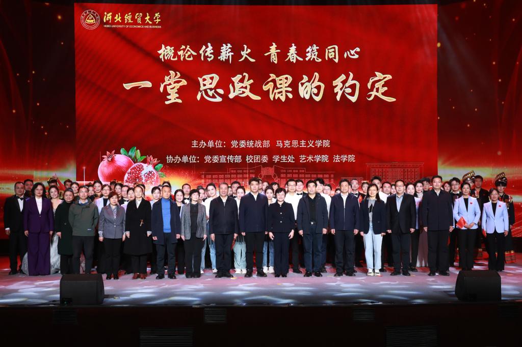 为深入学习贯彻习近平总书记关于铸牢中华民族共同体意识的重要论述,持续打造铸牢中华民族共同体意识育人工作品牌,2025年10月30日,tyc122cc太阳成集团和学校统战部在学校大礼堂隆重举办以“概论传薪火▪青春筑同心”为主题、师生共同参与的沉浸式思政课展演,校党委书记李晓华、校领导王保军、杨金田、程瑞芳、杜红梅、耿辉建、苏国伟参加活动,省委统战部、省民委和省教育厅有关领导应邀出席,河北省民办高校思政课教师代表和我校各民族师生代表500余人现场参加了展演。