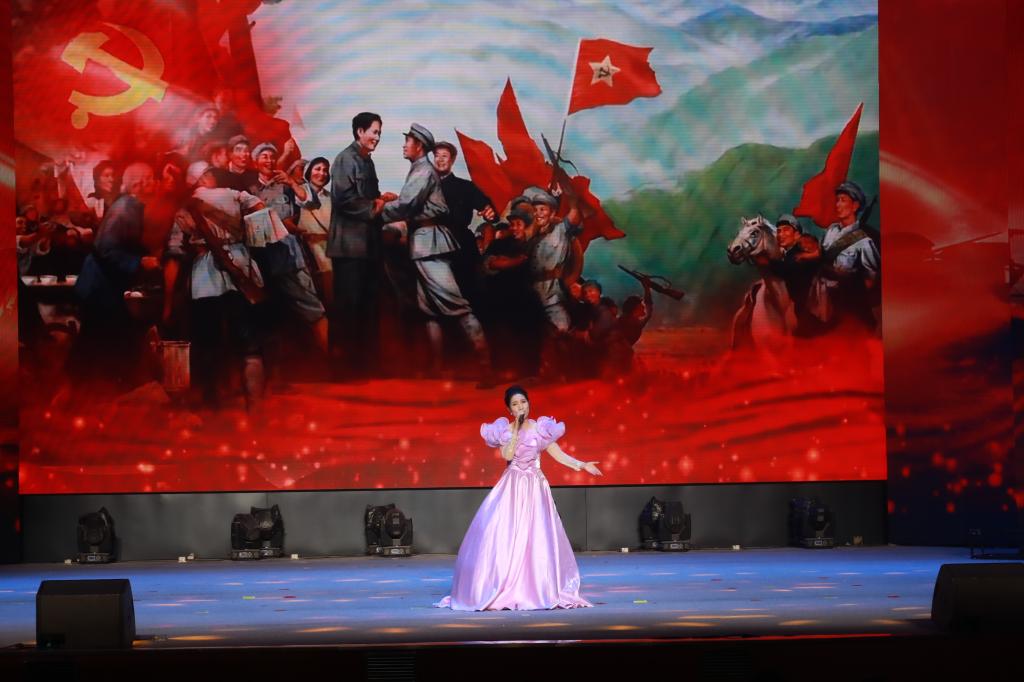 “火种”篇章追寻革命初心的播撒之路。李英老师深情回顾了建党百年来中国共产党团结带领中国人民探索民族复兴的历史征程。歌曲《南湖的船,党的摇篮》旋律悠扬,回溯中国共产党一经诞生,就把为中国人民谋幸福、为中华民族谋复兴作为自己的初心使命;情景剧《彝海结盟》生动演绎了长征途中刘伯承与彝族首领小叶丹结盟的感人场景,展现“汉彝一家亲”的深厚情谊。