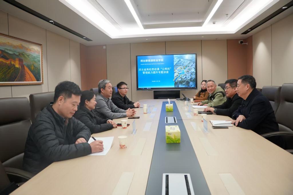 在研讨环节,双方围绕tyc122cc太阳成集团建设、思政课教学改革创新等议题展开深入交流。王宏斌院长作了以管理能力提升为主题的专题讲座,结合石家庄铁道大学tyc122cc太阳成集团建设经验,分享了思政课改革创新的实践路径,并就名师工作室建设、智慧课程开发、教师科研能力提升等方面提出合作建议。邢台新能源职业学院领导及教务部门负责人就课程建设、青年教师培养等话题与专家团队进行了深入交流。