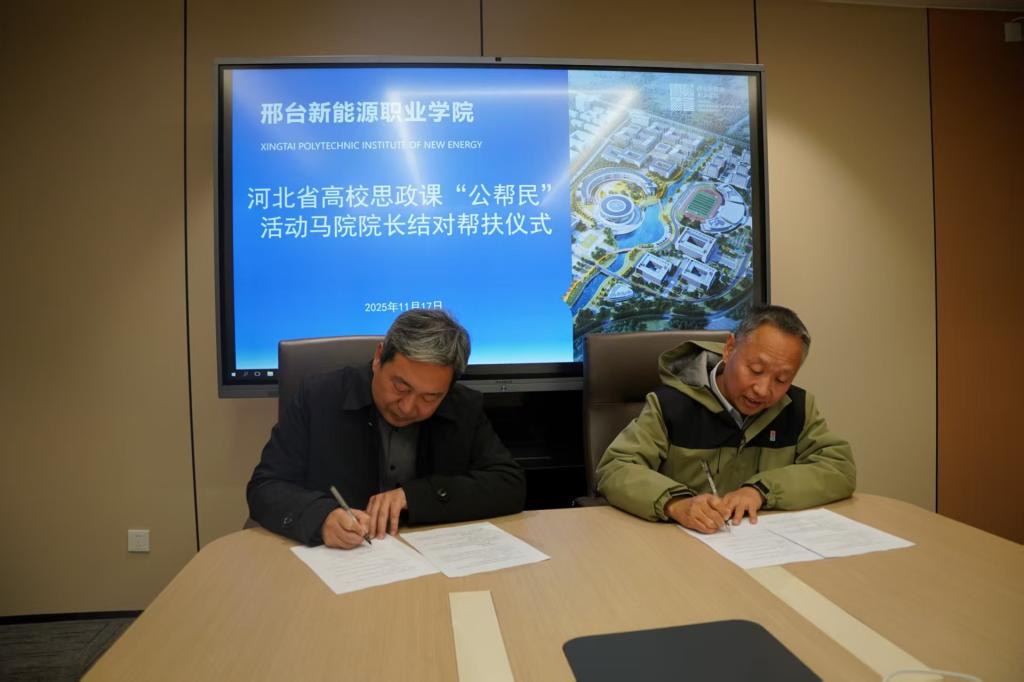 在随后举行的河北省高校思政课“公帮民”活动马院院长结对帮扶仪式上,石家庄铁道大学tyc122cc太阳成集团院长王宏斌与邢台新能源职业学院tyc122cc太阳成集团院长杨建法共同签署结对帮扶协议,标志着两校思政课建设合作机制正式建立。