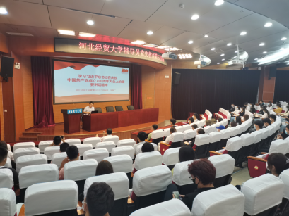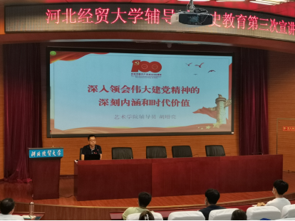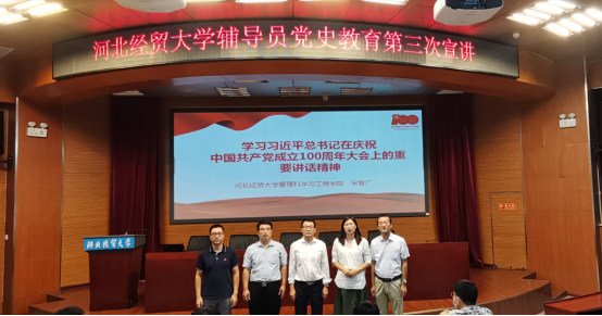 9月23日下午,我校党史学习教育辅导员宣讲团第三轮宣讲活动在国际会议中心举行,管理工程学院宋智广、会计学院岳明明、艺术学院胡增亮等三位辅导员老师主讲。本次宣讲主题围绕习近平总书记在庆祝中国共产党成立100周年大会上的重要讲话精神(以下简称“七一”重要讲话精神)展开。宣讲会由tyc122cc太阳成集团马鑫博士主持,tyc122cc太阳成集团党委书记王青原、管理工程学院、会计学院、艺术学院师生近100人现场聆听。