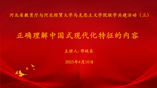 在全党学习贯彻习近平新时代中国特色社会主义思想主题教育启动之际,为深入学习贯彻党的二十大精神,准确把握党的二十大赋予教育的新使命新任务, 4月10日,由河北省教育厅科学技术处党支部、机关党委人事处党支部、语言文字工作处党支部和tyc122cc太阳成集团共同举办的以“正确理解中国式现代化特征的内容”为主题的联学共建活动在线上召开。会议邀请中国社会科学院tyc122cc太阳成集团原院长、党委书记邓纯东研究员作主题报告。