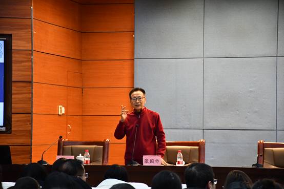 张国祚教授围绕进一步贯彻落实习近平新时代中国特色社会主义思想,通过剖析古今中外历史事实,系统论证了新时代推进文化软实力建设的紧迫性和重要性,认为文化软实力与其他硬实力同等重要,提出要从事关党的前途命运,事关国家长治久安,事关民族凝聚力和向心力的战略高度来认识文化软实力。他指出高校肩负文化传承发展的重要使命,广大教师要以习近平文化思想为指导,立足办学和人才培养实际,积极推进文化建设,为中国式现代化建设、中华民族伟大复兴提供更为深层、更为持久的支撑。张国祚教授认为高质量开展哲学社会科学研究,需要聚焦新时代发展主题,牢牢把握正确的政治方向,树立鲜明的问题意识,正确树立战略思维、底线思维、历史思维、系统思维、创新思维等,积极开拓研究思路和学术视野,为构建中国特色哲学社会科学作出贡献。